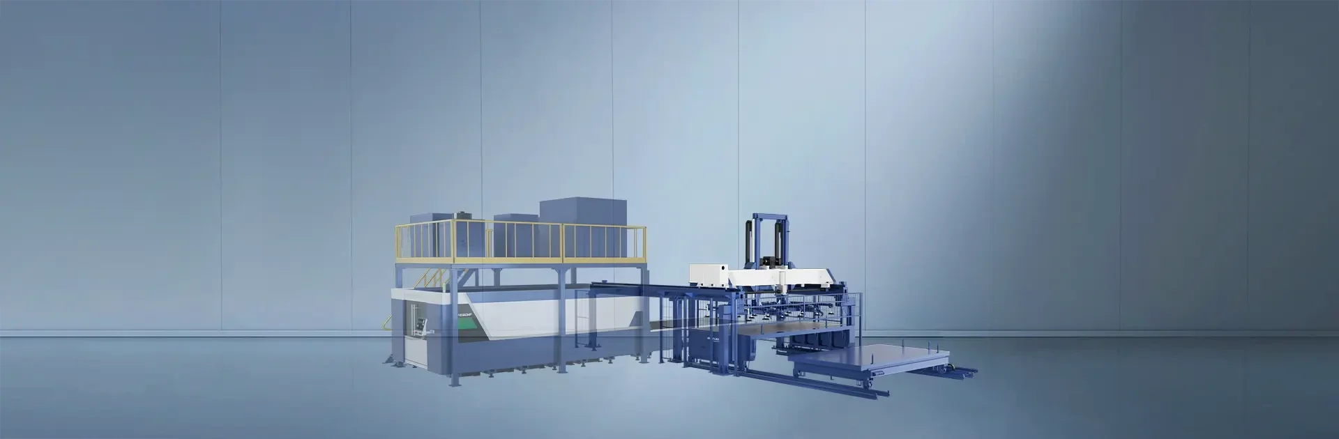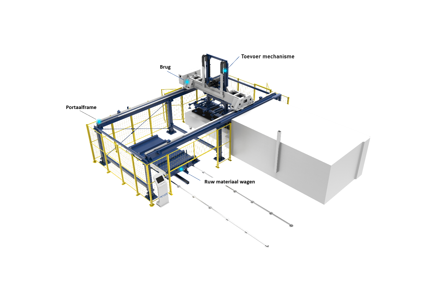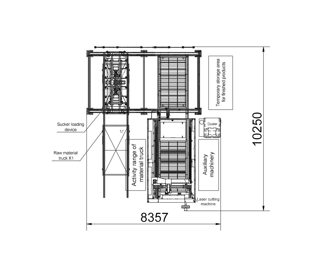 Het systeem is uitgerust met een 4-tons ruw materiaal wagen die zelfstandig over rails beweegt en zo het automatisch beladen van materiaal verzorgt. In de uitvoering als ruw materiaal wagen vervangt deze het traditionele magazijn en zorgt hij voor een kostenefficiënte, automatische toevoer naar de productielijn. Wanneer hij wordt ingezet als sorteerwagen, verzamelt hij zowel werkstukken als restmateriaal centraal, waardoor de productieafdeling het sorteerproces en de enkelstuksafvoer flexibel en efficiënt kan organiseren.