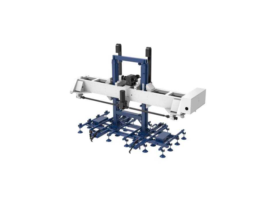 De truss beweegt horizontaal over het portaalframe via cam-lagers, wat resulteert in een stabiele, soepele en uiterst precieze handling van het materiaal.